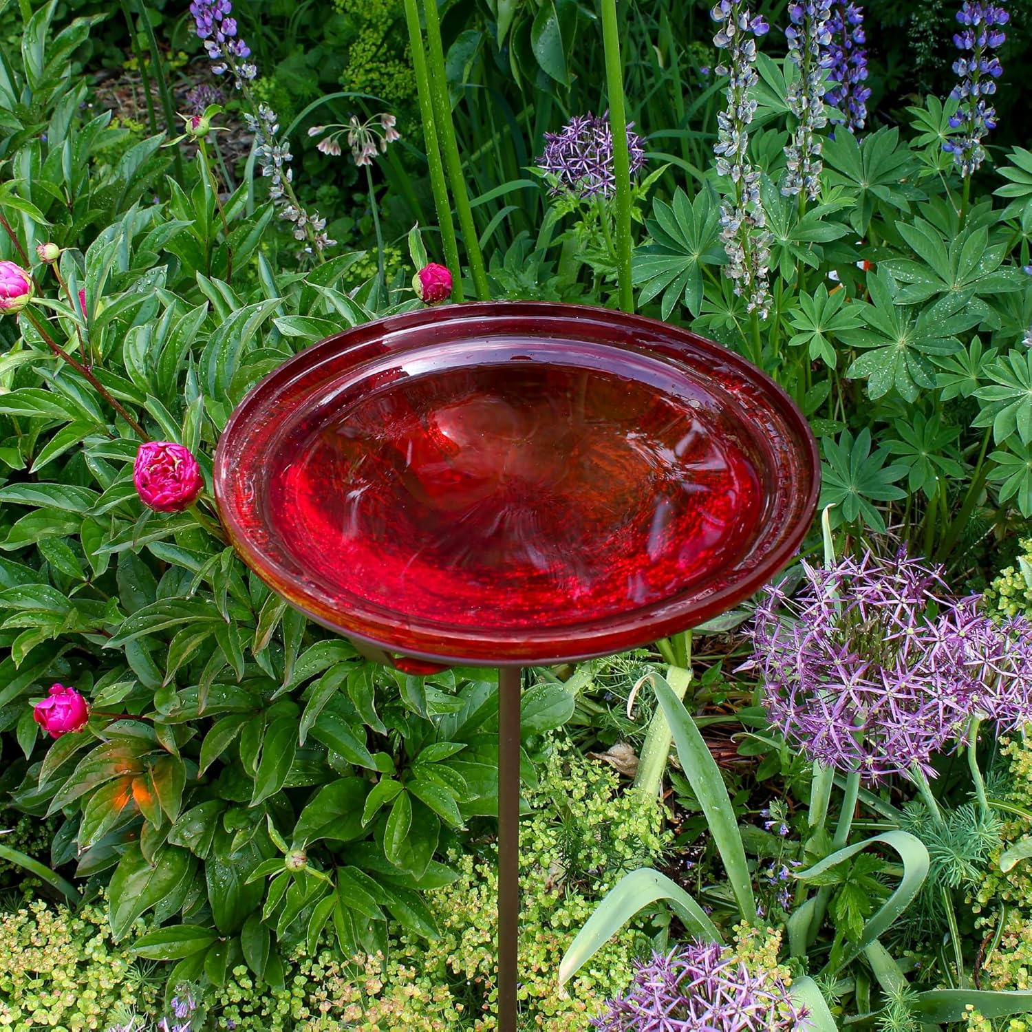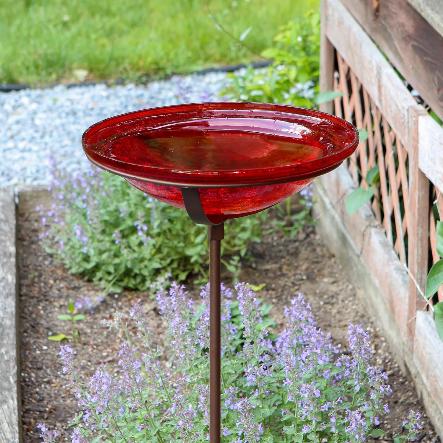 Reflective and brilliant, our Crackled Glass Birdbath Bowls are sparkling gems in the garden. The Glass bowls are made from hand-blown glass in five vibrant colors, measuring 12 ½” diameter x 2 ½”D. A wrought iron Cradle that holds the glass bowl is threaded to the garden Stake. Planted right into the garden or lawn, these colorful birdbaths create a bright pop anywhere in the garden. Birds will enjoy a safe place to cool off and drink some water, and gardeners will love having this beautiful piece to accent the plantings. Crackled Glass Birdbath Bowls are also available sold separately or with a Hanging Ring. Makers of fine quality goods for the home and garden since 1994, we offer a full line of Achla Designs wrought iron landscape structures, plant supports and stands, birdbaths and other decorative garden elements for the patio, porch, deck and yard.