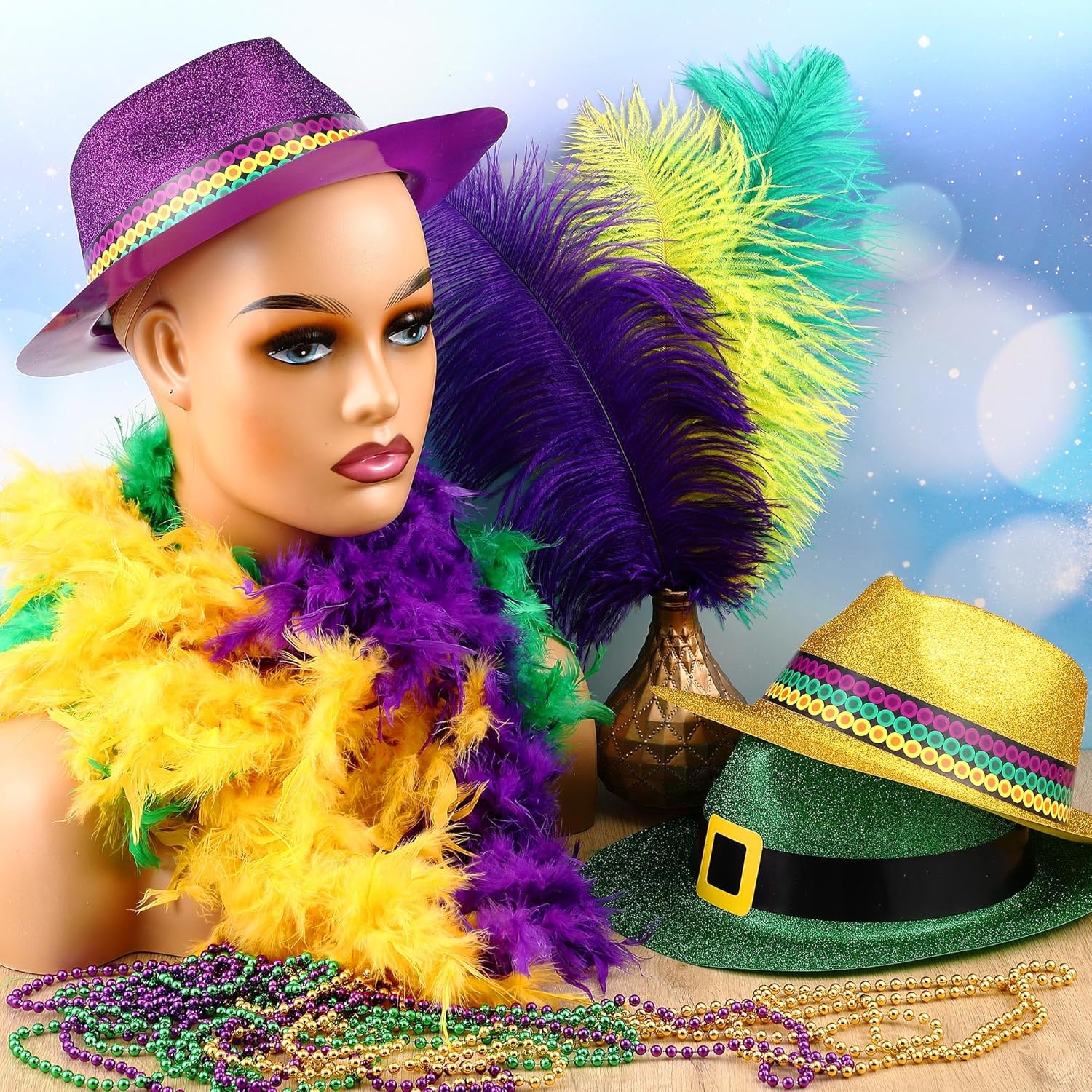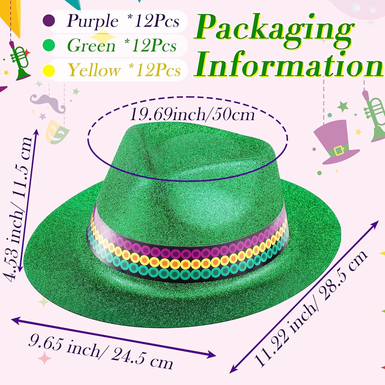 Features: Crafted from quality PVC material with glitter, this vibrant Mardi Gras decor is designed to embody the lively spirit of the Mardi Gras festivities. The glitter coated surface adds an eye catching glitter to every movement, adding to the overall effect of your outfit. Enhance the fun of Mardi Gras with our carnival inspired plastic party hat. Whether you're planning a carnival party, parade, masquerade, or even Christmas costumed events, these hats bring a playful touch to the occasion. Specifications: Material: PVC with glitterColor: purple, yellow and greenSize: about 4.53 inches/ 11.5 cm in height, about 9.65 inches/ 24.5 cm in width and about 11.22 inches/ 28.5 cm in lengthHead circumference: about 19.69 inches/ 50 cmPackage includes: 36 x Mardi Gras hatNotes: Manual measurement, please allow slight errors on size. The color may exist a slight difference due to different screen displays. The glitter may shed slightly.