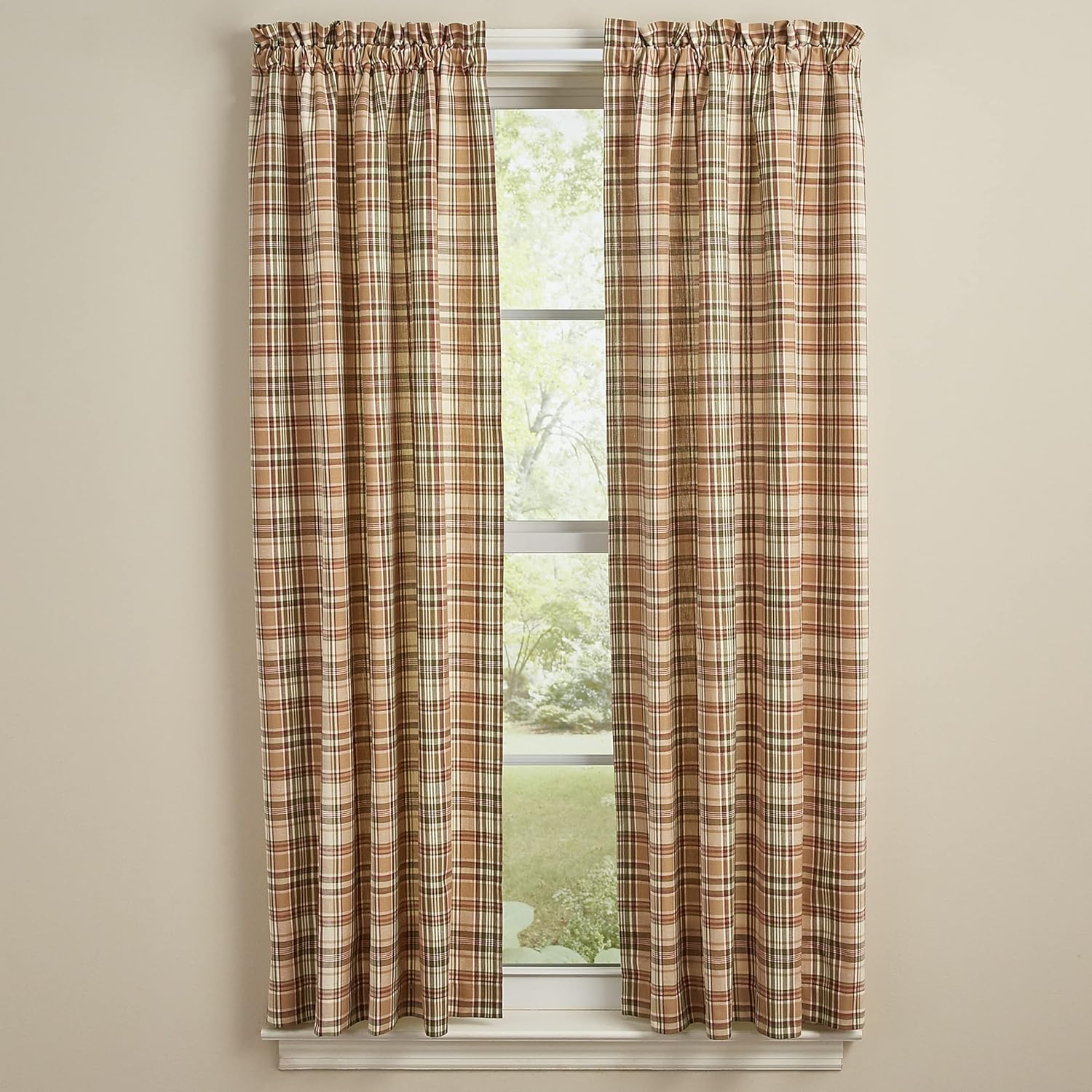 Thyme 84" panels curtains by Park Designs. 100% cotton plaid fabric in burgundy, pine green, tans, and cream with matching tiebacks. Fully lined. Curtains have a 1-1/2" header and a 2" rod pocket. Shirr on conventional curtain rods. Panels come in two pieces for a split panel pair with each measuring 36" wide for a total curtain width of 72". Total measurement is 72"wide x 84"drop.