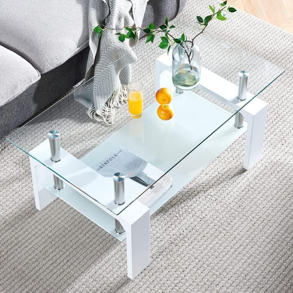 White/Black A Description:6MM transparent thick and durable safety glass. 5MM frosted thick glass for bottom shelfEasy self-assemblyShape: RectangleSize: 37.4"×21.6"×17.7"(L×W×H)White/Black A Package Included:1 × Coffee table1 × Installation instructions & fittingsWhite/Black B SpecificationShape: RectangleSize: L 39.3''* W 23.6'' *H 17.3''Material: Top piece 6mm transparent tempered glass + Bottom piece 5mm frosted glass +MDF leg +SONOMA stickerWhite/Black B Package Included1 × Coffee tableWhite/Black C SpecificationShape: RectangleSize: L 39.1''* W 23.4'' *H 17.1''Material: The upper layer is 6mm toughened glass + the lower layer is 5mm frosted glass + black spray iron pipeWhite/Black C Package Included1 × Coffee tableWhite/Black D SpecificationShape: OvalSize: L 35''* W 20'' *H 18''Material: The upper layer is 6mm toughened glass + the lower layer is 5mm frosted glass + black spray iron pipeWhite/Black D Package Included1 × Coffee table