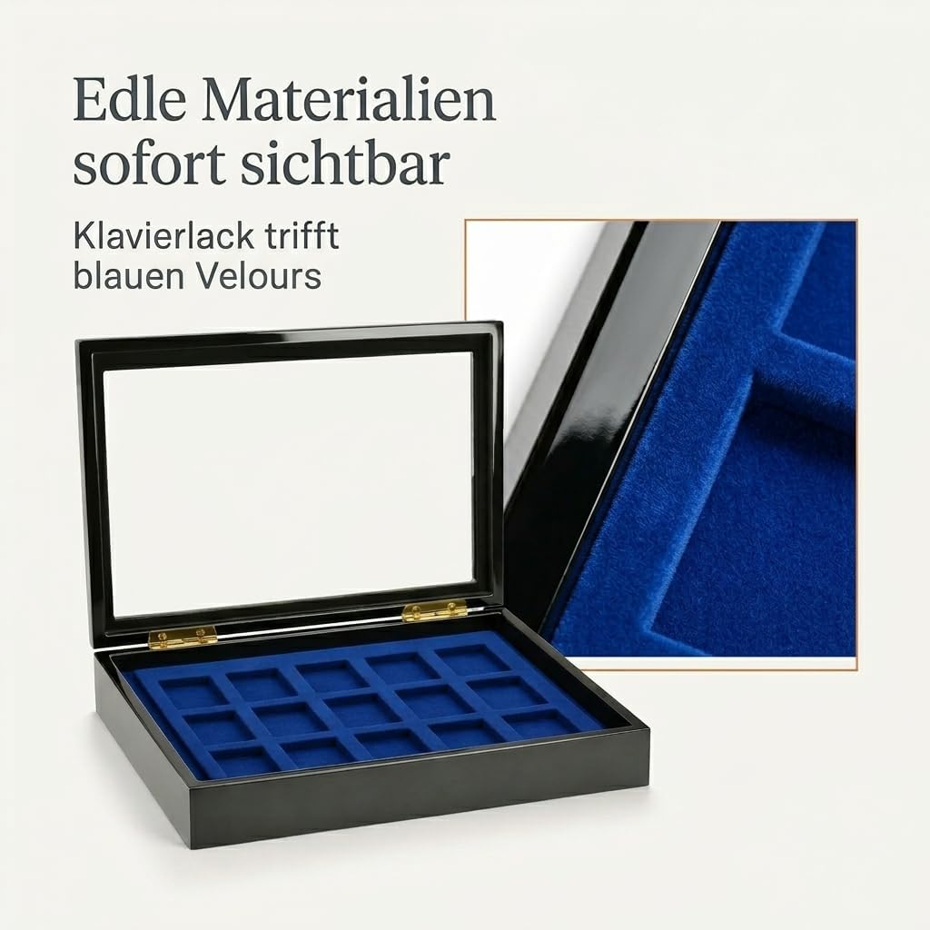 Zippo Lighter Display Case for 15 lighters Solid wood cabinet with high gloss black surface and acrylic glass top. Royal blue velvet tray to secure lighter Suitable for wall mounting with included hanging hardware Solid metal hinges with magnetic closure. Case size: Approx. 15" x 10-1/2" x 1-5/8" deep