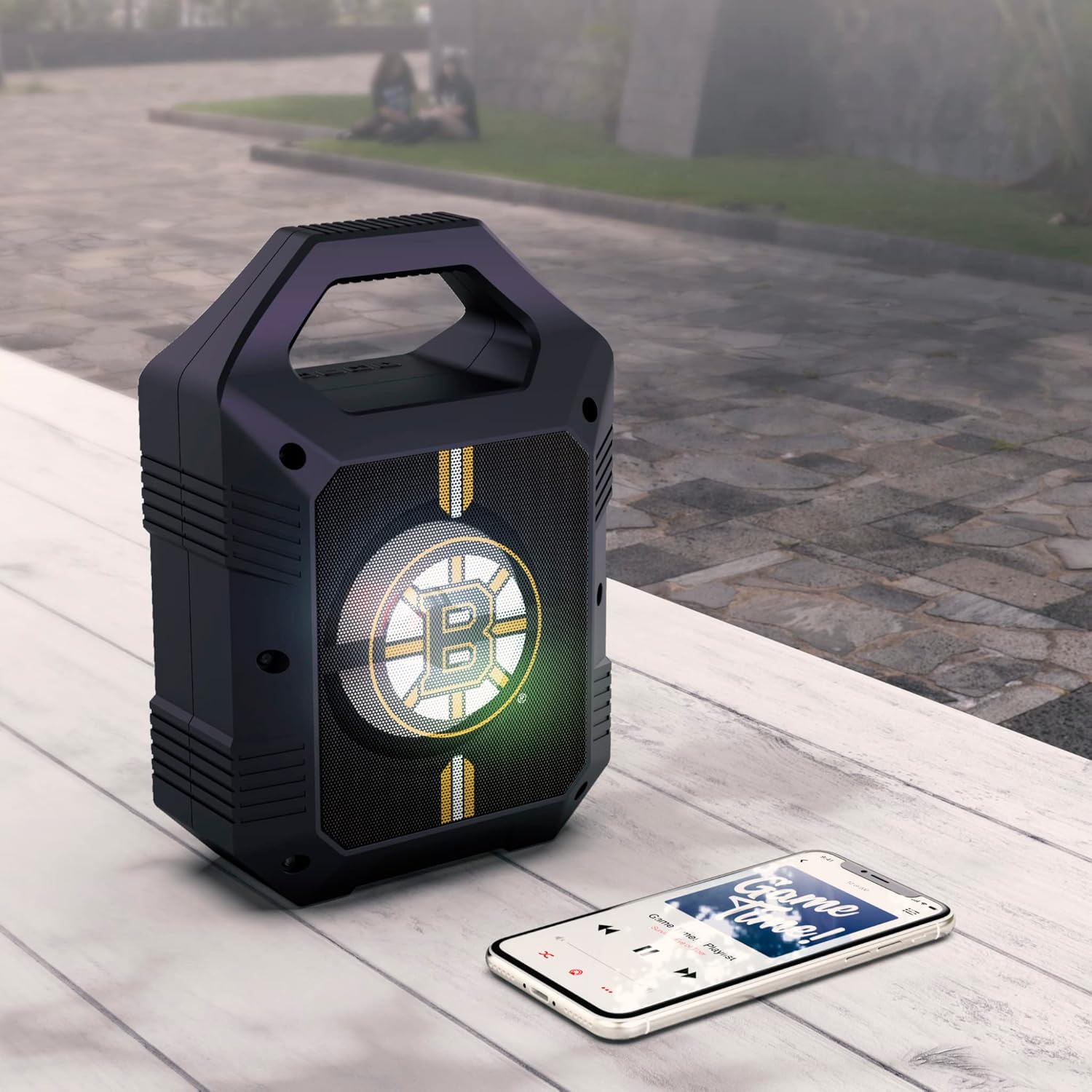 The SOAR XL LED Speaker is the perfect speaker for your next tailgate or camping trip. Light weight with a convenient top handle for easy portability and storage. Bluetooth 5.0 technology, AM/FM radio, USB, and Aux inputs, play your music your way.  Easily sync two together for stereo sound. Over 5 hours of use time per charge, micro-USB cable included. Officially Licensed NHL Product, a great way to show your team spirit any time and anywhere.