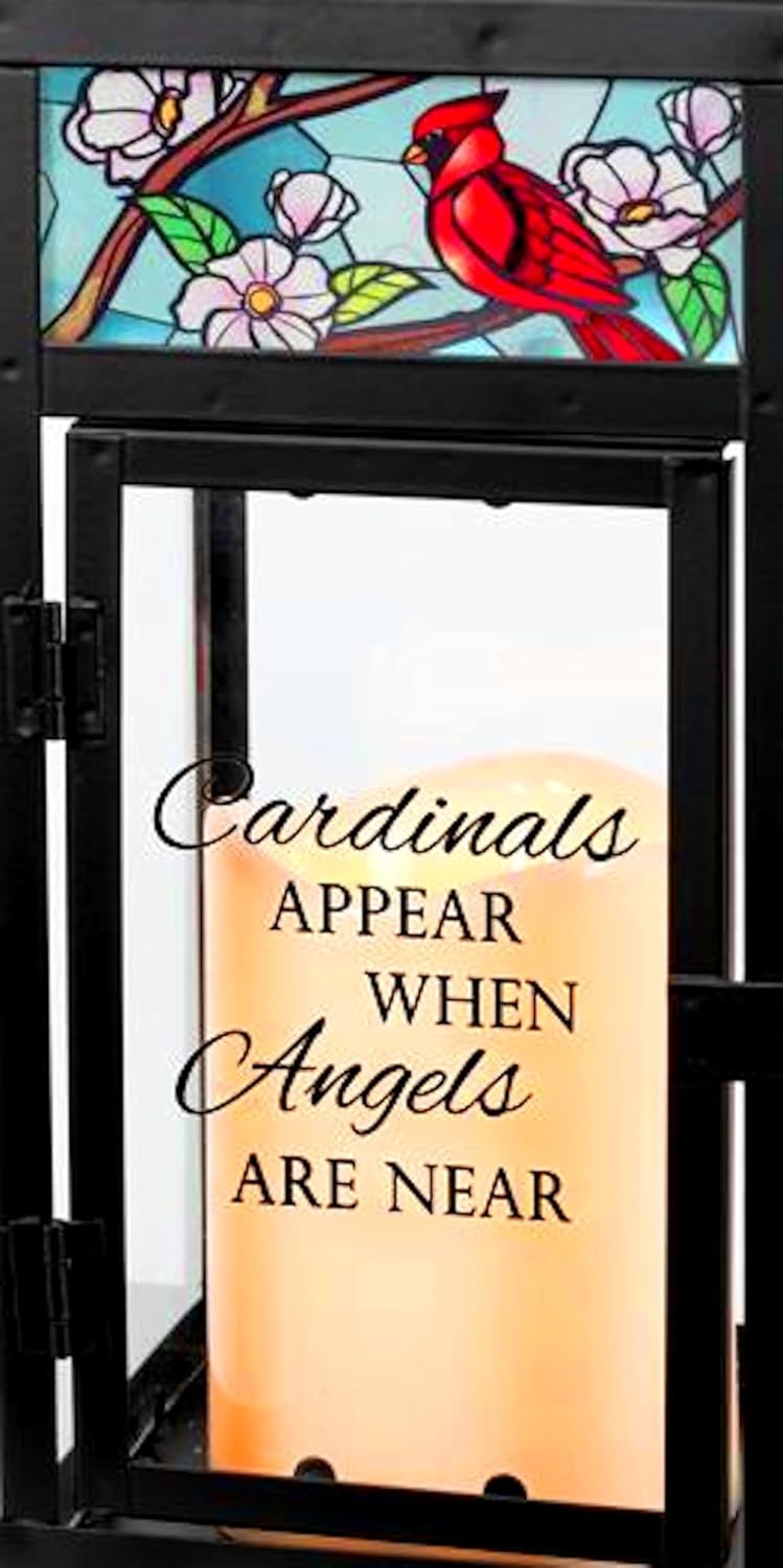 This cardinal memorial lantern is the perfect accessory for your memorial decor! Crafted from metal and glass to bring remembrance the fond memories with family and friends who have passed with the imagary of a red cardinals perched on a flowering branches with blue background set above a clear door with the message of "Cardinals Appear when Angels are Near" that opens to a flameless candle, this sturdy stained glass candle holder lantern looks great on a mantle, end table, hanging from a hook in your living room, or more. Both functional and stylish, this memorial lantern makes a great decor accent that fits with a variety of decorating styles: cardinal, cottagecore, country, nature, and more. The cardinal decor measures 4.25"L x 4.25"W x 12"H and features a handle for hanging, hardware NOT included. Door opens to show a flameless candle that requires 3 AAA batteries - batteries are NOT included. Weather resistant for indoor and outdoor use.
