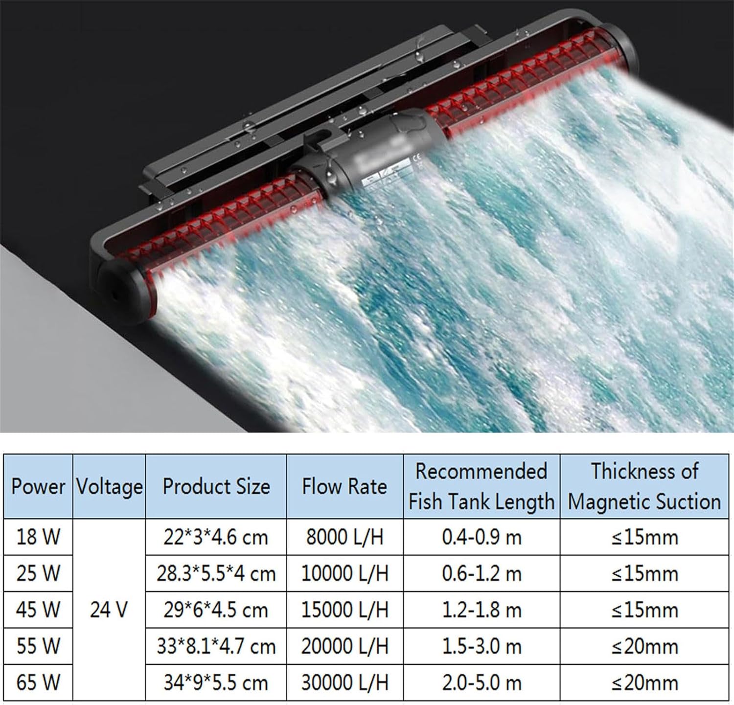 The wave pump has a wider water outlet, ensuring gentle and comprehensive water circulation. Say goodbye to dead spots as it realistically simulates ocean currents, creating a more realistic ocean environment for your aquatic friends.Product specifications:Product name: Cross flow PumpVoltage: 100V-240VPower: 18W/25W/45W/55W/65WWave Mode: 4 ModesFlow Adjustment: 10 Levels18W --- Size: 22*3*4.6 cm; Recommended Fish Tank Length: 0.4-0.9 m; Thickness of Magnetic Suction: ≤15mm;25W --- Size: 28.3*5.5*4 cm; Recommended Fish Tank Length: 0.6-1.2 m; Thickness of Magnetic Suction: ≤15mm;45W --- Size: 29*6*4.5 cm; Recommended Fish Tank Length: 1.2-1.8 m; Thickness of Magnetic Suction: ≤15mm;55W --- Size: 33*8.1*4.7 cm; Recommended Fish Tank Length: 1.5-3.0 m; Thickness of Magnetic Suction: ≤20mm;65W --- Size: 34*9*5.5 cm; Recommended Fish Tank Length: 2.0-5.0 m; Thickness of Magnetic Suction: ≤20mm;Packing list:1 * Aquarium Wave MakerNotice:- If you have any questions about this product, please write to us and we will be happy to provide you with service.